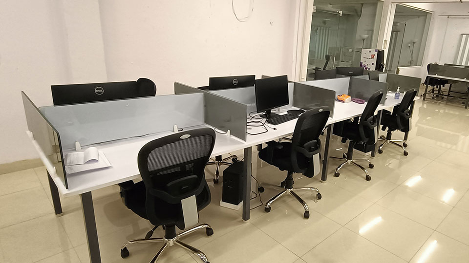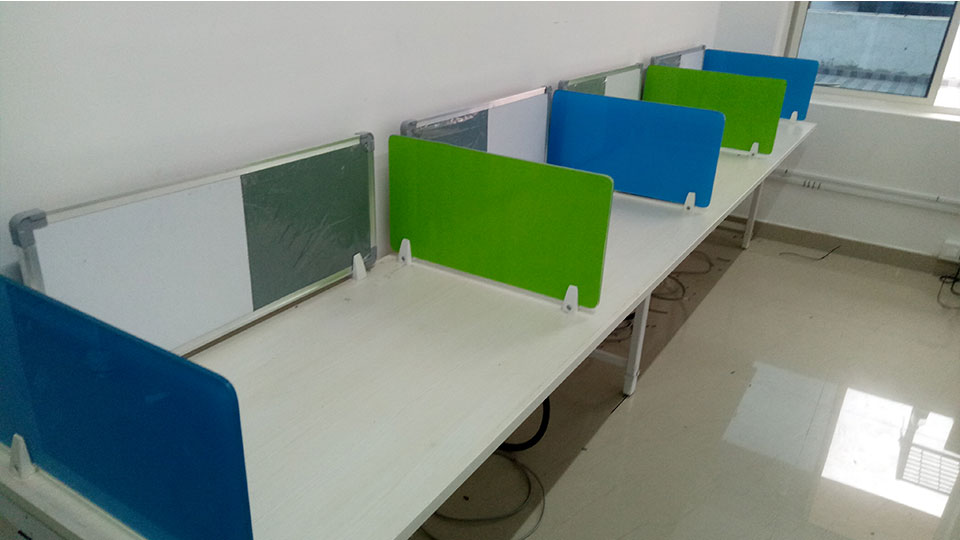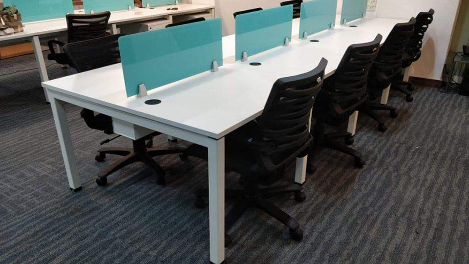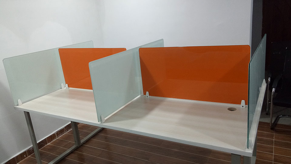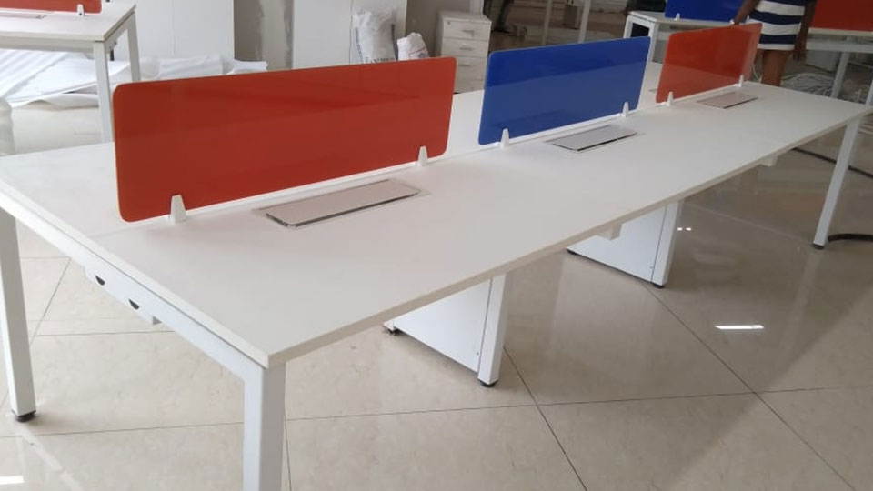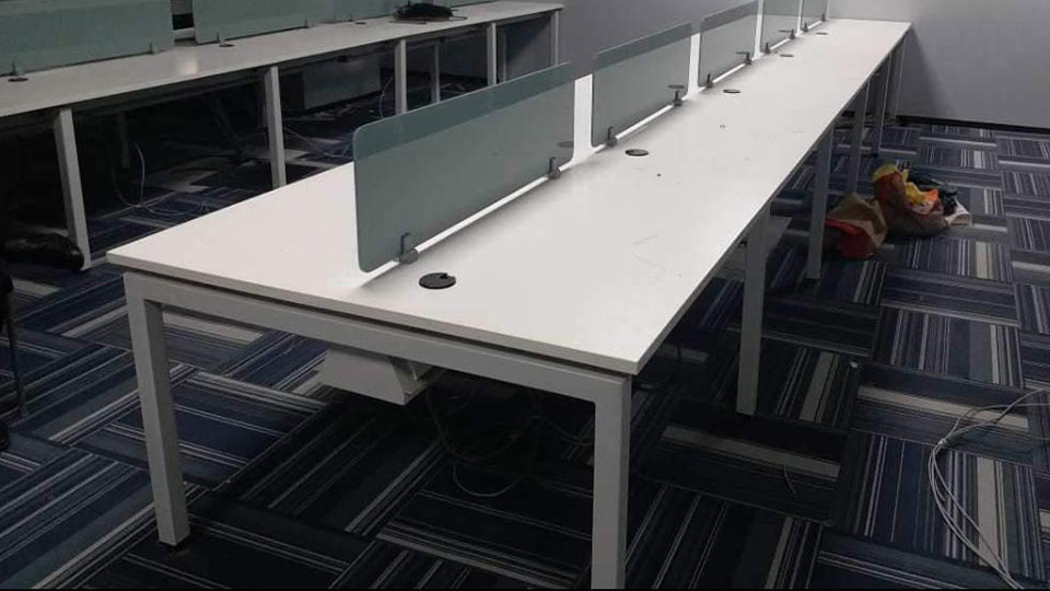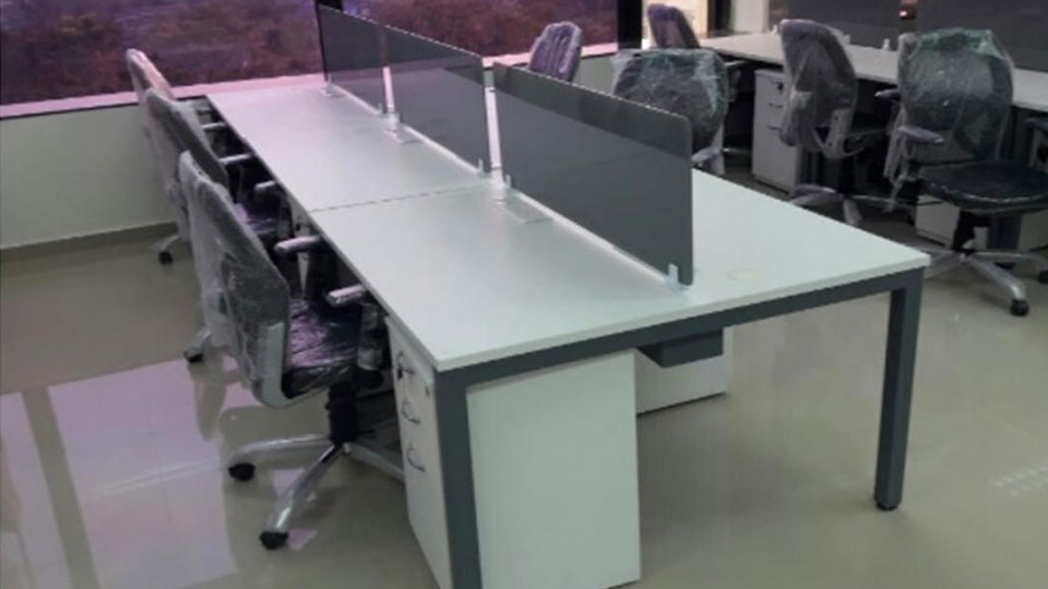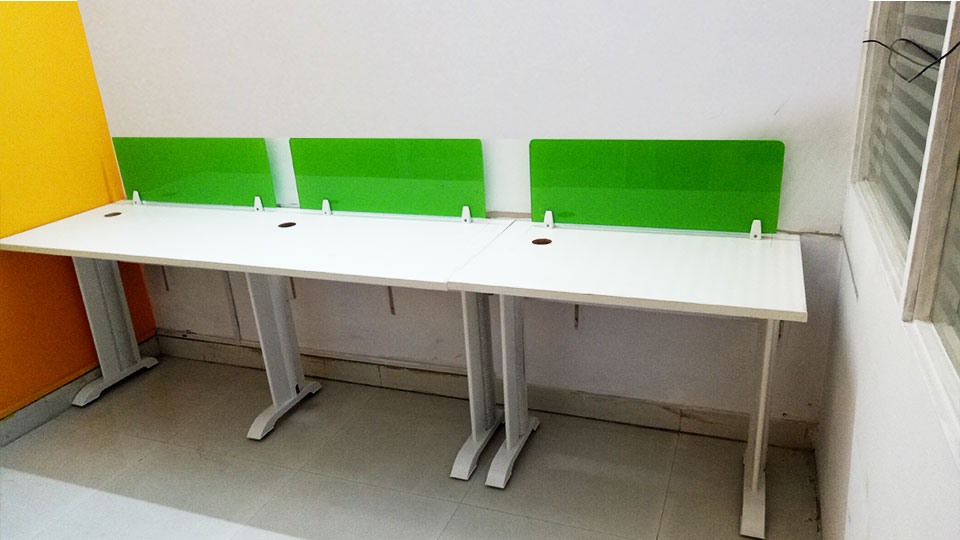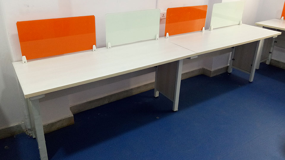 Features : * 4 x 2 feet top with 25mm thickness and 2mm edge binding * metal modular legs with supporting ms rods * power and network raceway